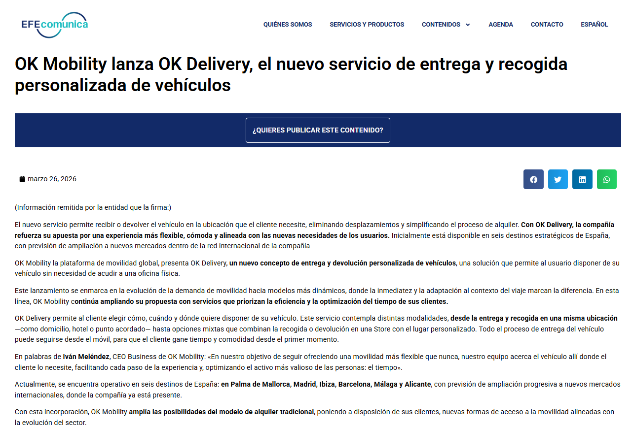Agencia EFE: OK Mobility lanza OK Delivery, el nuevo servicio de entrega y recogida personalizada de vehículos